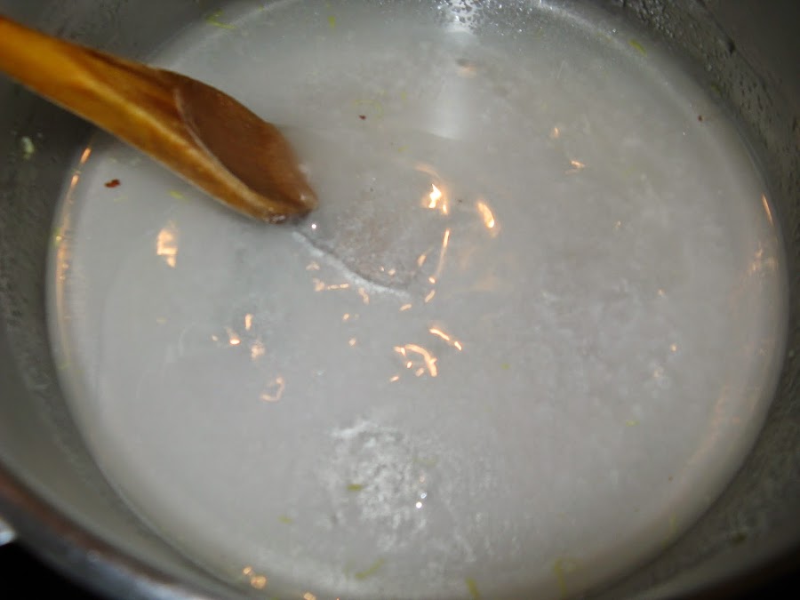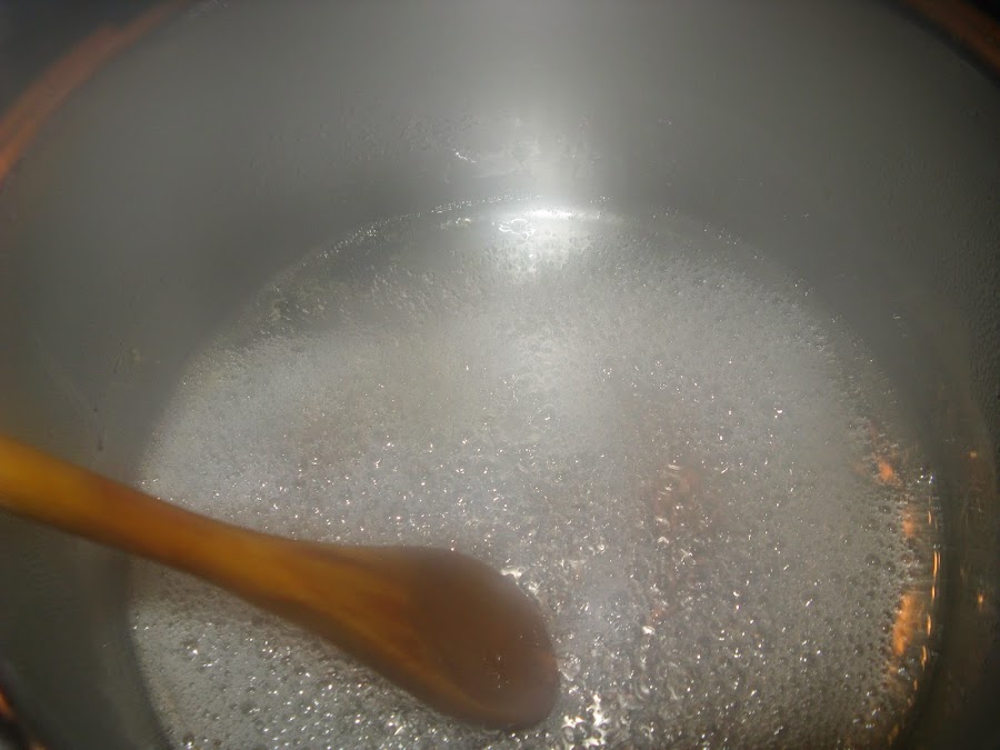 Hay que hacer el almíbar, el punto exacto es alrededor de 115º si tenéis termómetro de cocina pues vais viendo, si no pues después de hervir que no pase mucho tiempo porque puede cristalizar