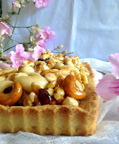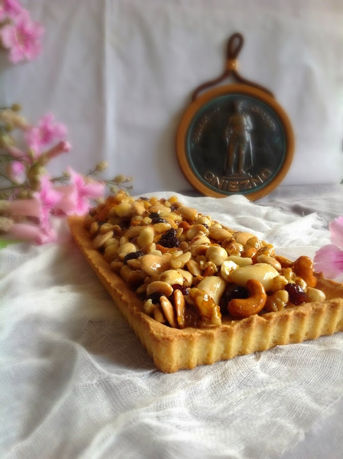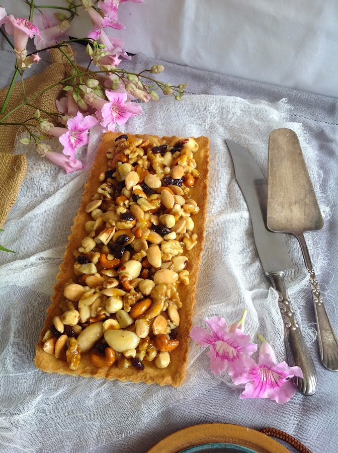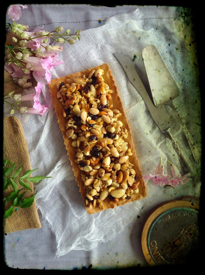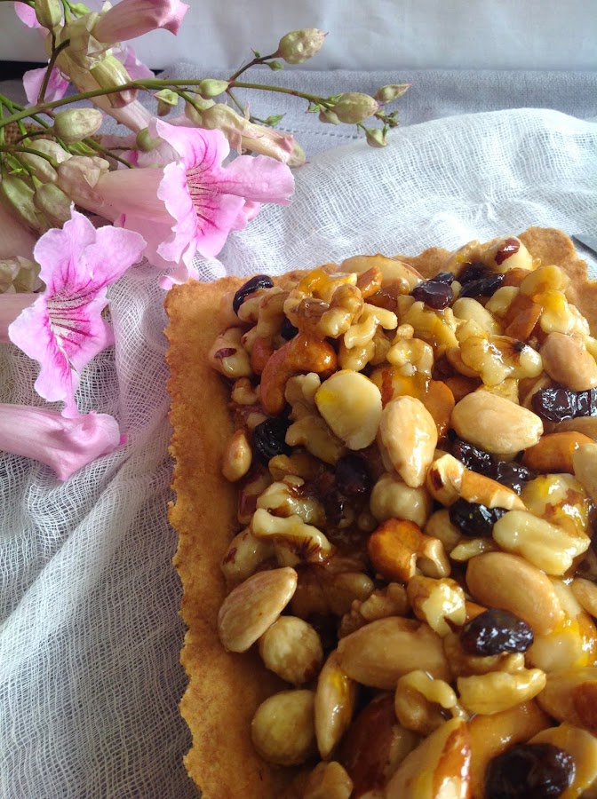 La comida polaca me pareció excelente y me traje algunas recetas muy caseras como unas tostadas polacas deliciosas y el bigos (¡qué me gusta! El otro día compré chukrut para hacerlo porque tengo ganas de volver a deleitarme con su sabor agridulce). Ésta del mazurek me la dio mi amiga Jowita y era tradicional en su casa durante la Pascua. Es una receta muy sencilla, con una pasta brisa deliciosa, se deshace en la boca, y un crujiente de frutos secos almibarados con una mermelada de melocotón que hace que el dulce sea más apetitoso. En algunos sitios lo he visto con un poco de crema, pero ese lo haré otro día. Hoy el que os traigo es el que yo probé y que está riquísimo.