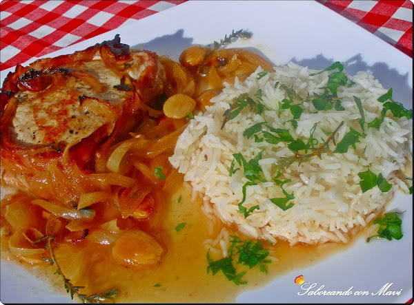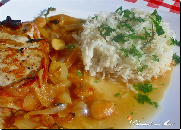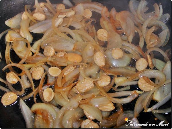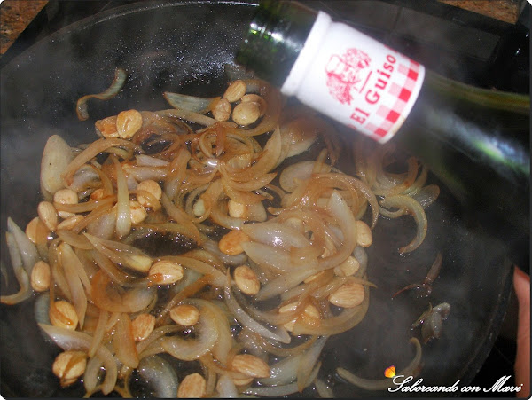 En el mismo aceite, si hace falta se añade más, salteamos la cebolla en juliana sal-pimentamos y añadimos las almendras y el vino. Lo dejamos pochar 2 minutos.