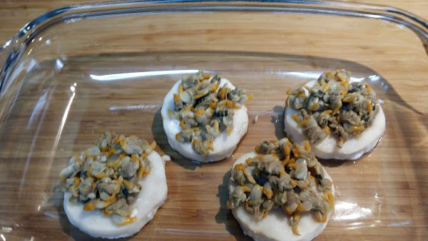En una bandeja para horno ponemos los medallones de merluza y repartimos por encima los berberechos