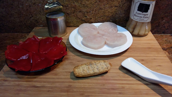 4 medallones de merluza o 2 rodajas grandes, 1/2 frasco de pimientos del piquillo asados, 1 cucharada de leche desnatada, 1/2 lata de berberechos, 1 biscote de pan.