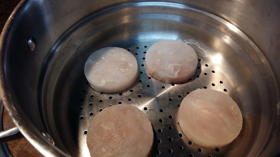 Empezamos poniendo la merluza a cocinarse al vapor. (Ya sabéis, una cazuela grande debajo con agua hirviendo, ponemos esta especie de colador encima con el pescado y que no toque el agua y se cocina con el vapor que sale del agua hirviendo.)