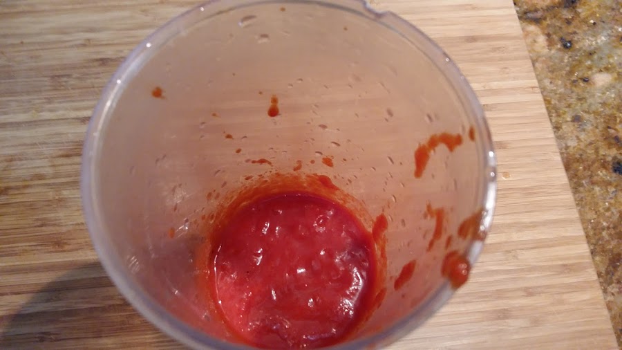 En el vaso de la batidora hacemos una crema con los pimientos de piquillo, jugo incluido y la cucharada de leche.