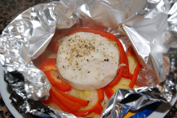 Sobre las verduras colocamos un medallón, salpimentamos y ponemos una pizca de orégano. Cerramos el papel de aluminio como un sobre procurando que esté bien cerrado.