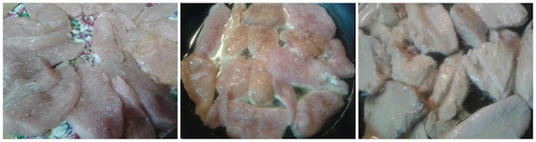 Salpimentamos los medallones de pavo. Los doramos en una sartén con 3 cucharadas de aceite, durante 2 minutos, por cada lado. Reservamos.