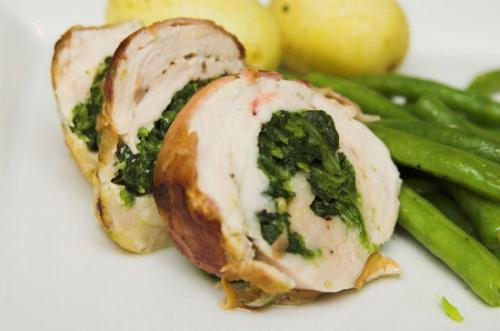 Primero vamos a filetear la pechuga para hacerla mas delgada como si la fueramos a colocar sobre la plancha, luego de extendida la pechuga agregaremos sal y pimienta sobre una de las caras de la pechuga colocamos cebolla, el ajo, la hoja de espinaca y las tajadas de queso, luego enrollamos la pechuga y la podemos asegurar con palillos de dientes para que no se suelte, agregamos sal y pimienta, la podemos cocinar en el horno a fuego medio alto por 25 minutos aproximadamente o en una sarten a fuego medio dejándola unos 8 a 10 minutos por cada lado luego de cocinado dejarlos reposar unos minutos antes de cortarlos .