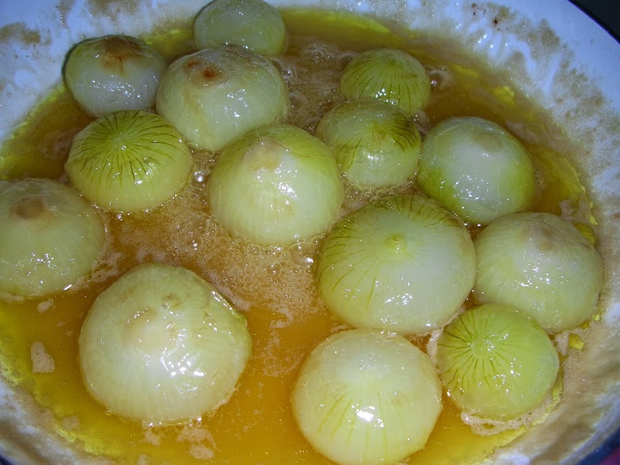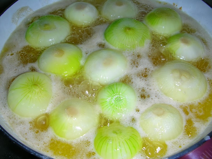1- Picamos y cortamos las cebollas, las manzanas enteras, y las uvas sin semillas. Ponemos una paella al fuego con unas tres cs de aceite oliva virgen, y las freímos despacio para que no se queme la cebolla, y la manzana, agregamos el vino y las dos cucharadas de azúcar, hasta que se vea la cebolla confitada y la manzana hecha, lo dejamos entibiar y la pasamos por una batidora o pasapure y lo reservamos.