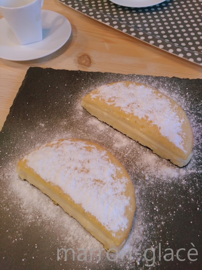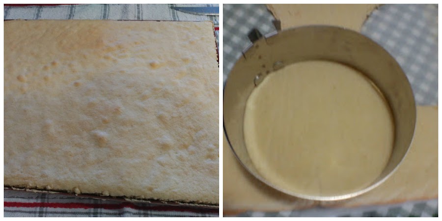 Una vez tengamos el bizcocho horneado cortamos los discos por la mitad y rellenamos con la crema pastelera que debe de estar fría para que no ablande demasiado el bizcocho.