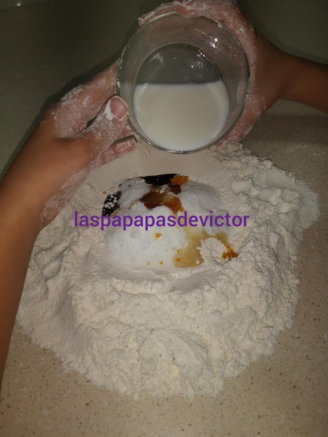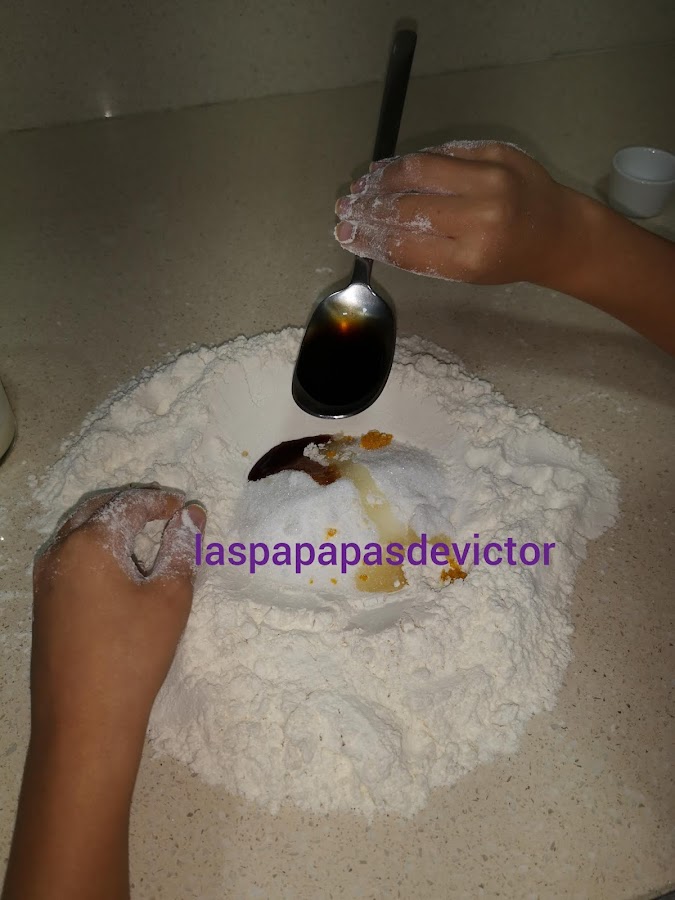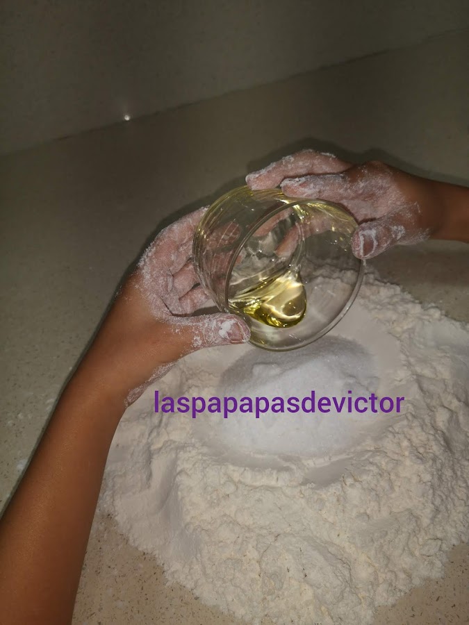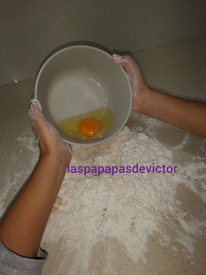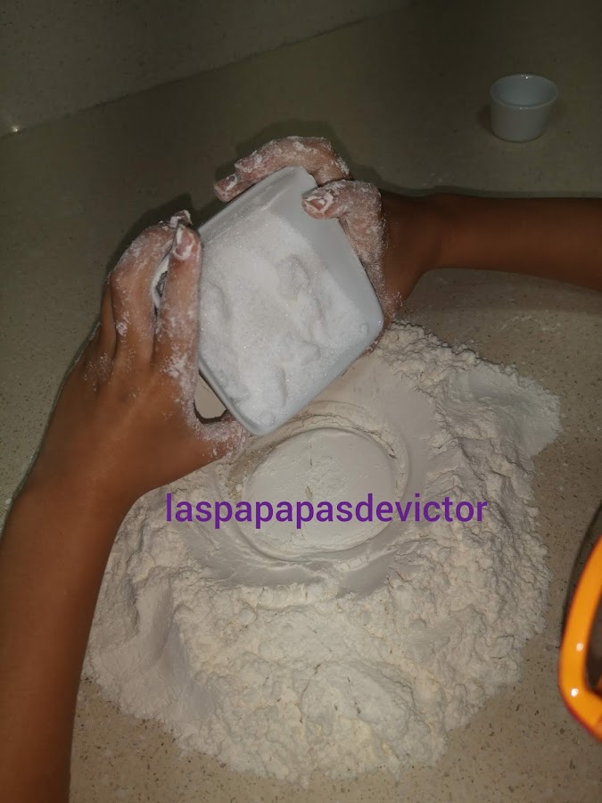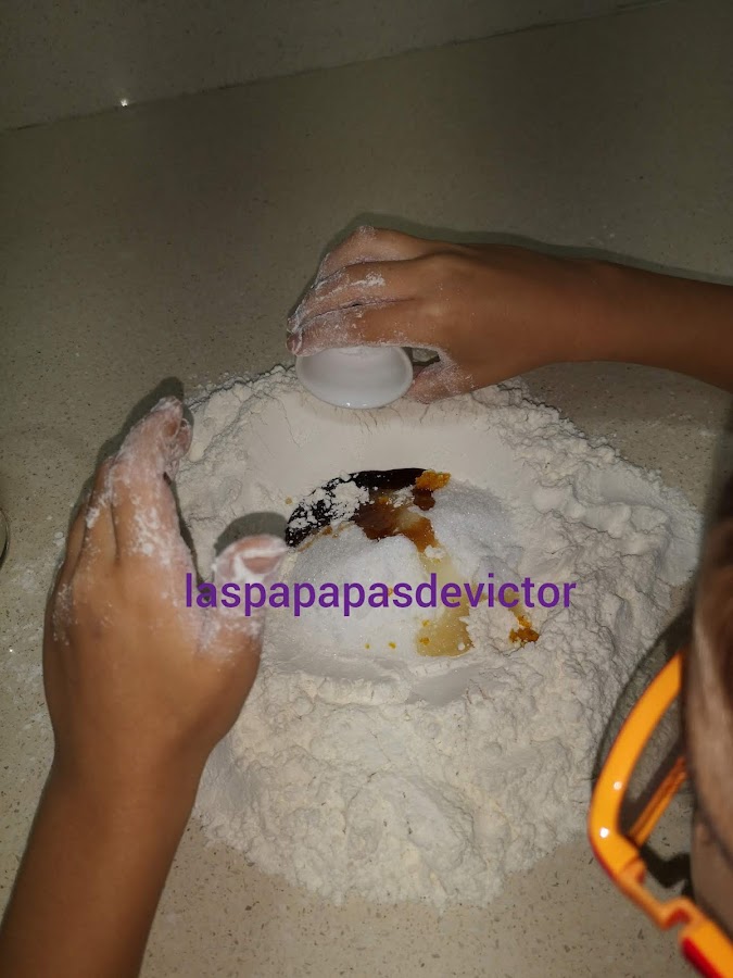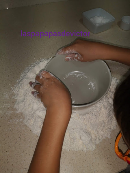 En la mesa de trabajo poner la harina y firmar un volcán el peque se ayudo de un bol