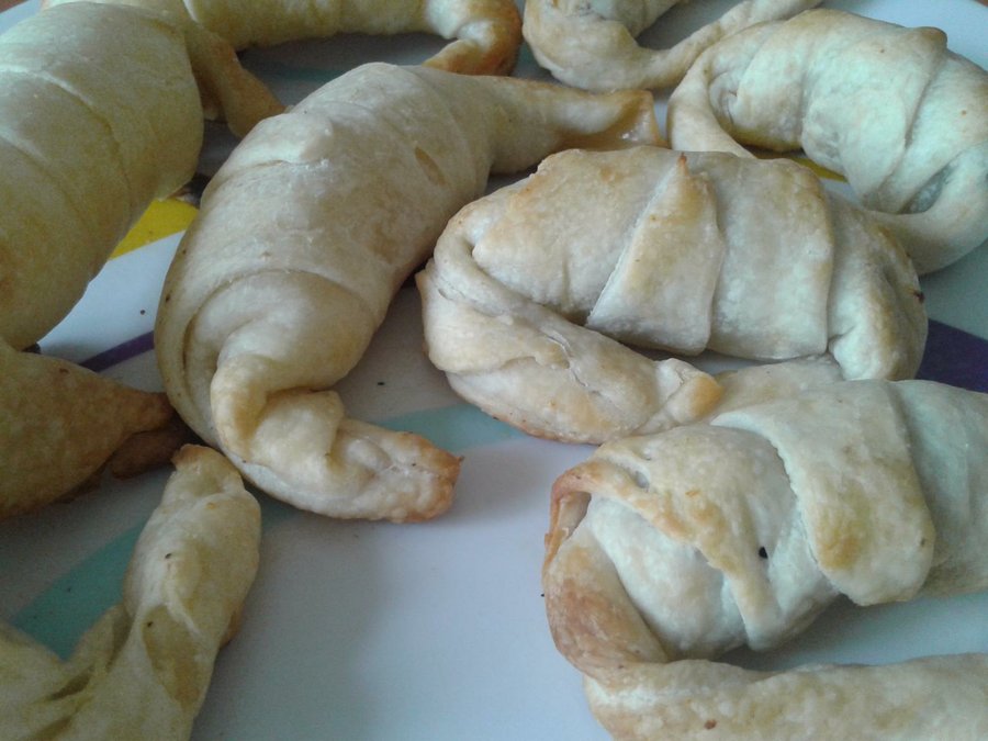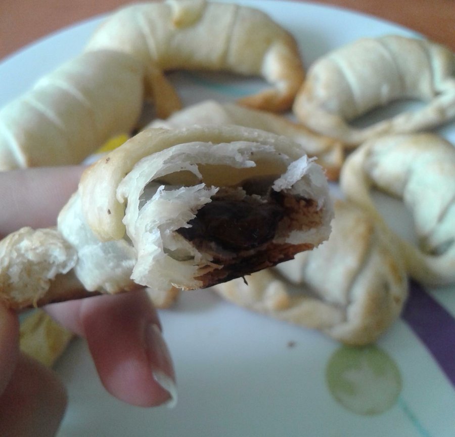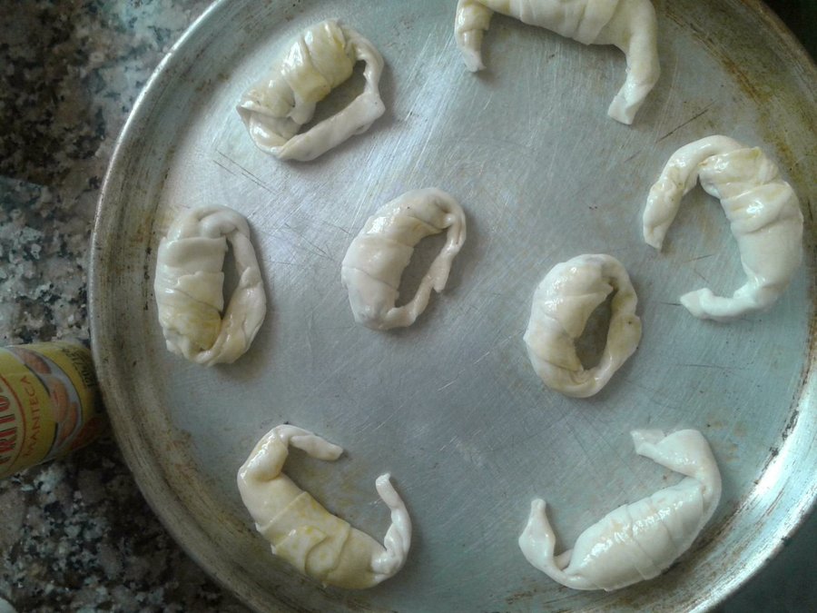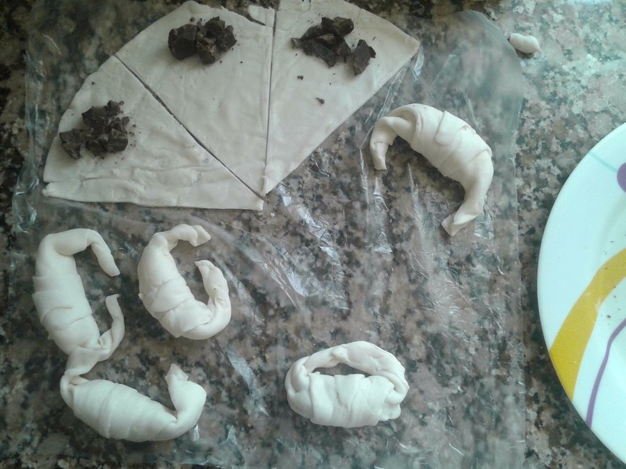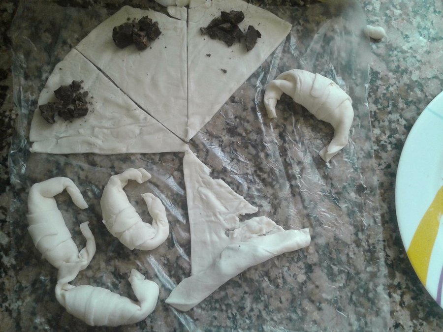 Antes que nada prendemos el horno a fuerte. Tomamos la masa y la partimos en octavos, en la base de cada porción ponemos el relleno y le damos la formita de medialuna