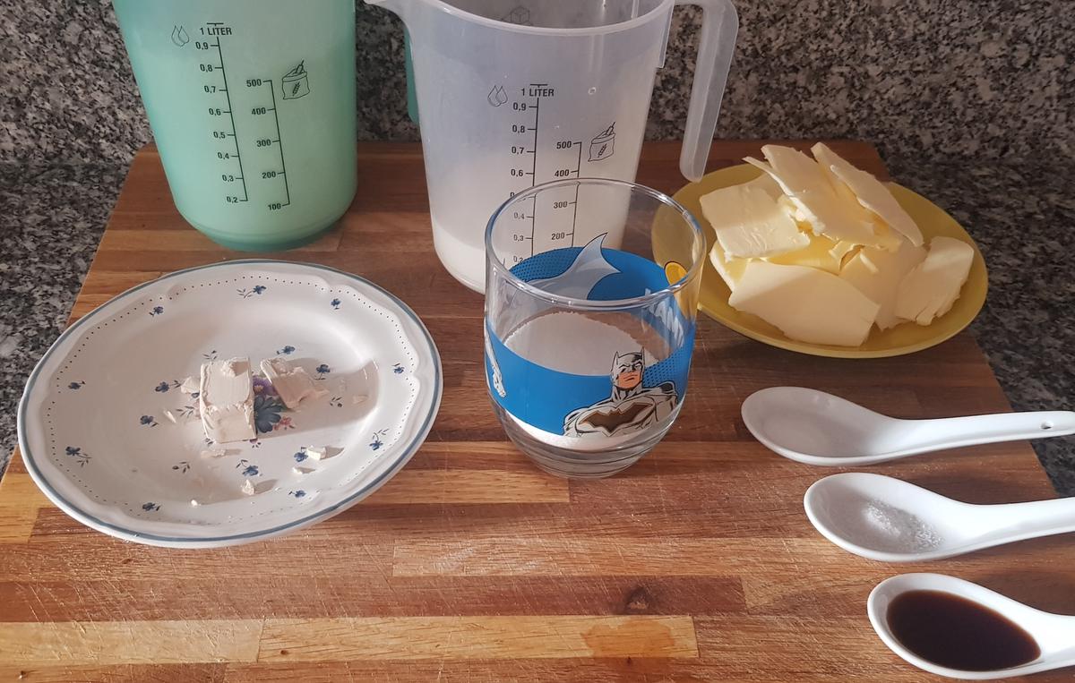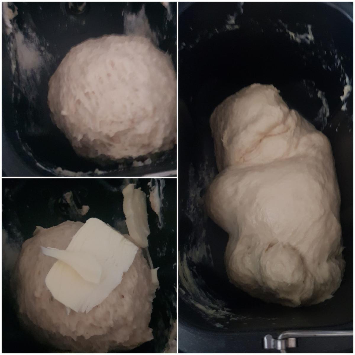 Integrar la mantequilla Cuando tengáis los ingredientes mezclados, la añadimos la mantequilla, que no esté fría de la nevera, que llevé una par de horas mínimo a temperatura ambiente. Seguimos amasando hasta que quede una masa lisa, sin grumos, tiene que quedar ligeramente pegajosa, no le echéis más harina porque los bollos quedarán duros. Si es en amasadora este proceso tardará unos 7-10 minutos.