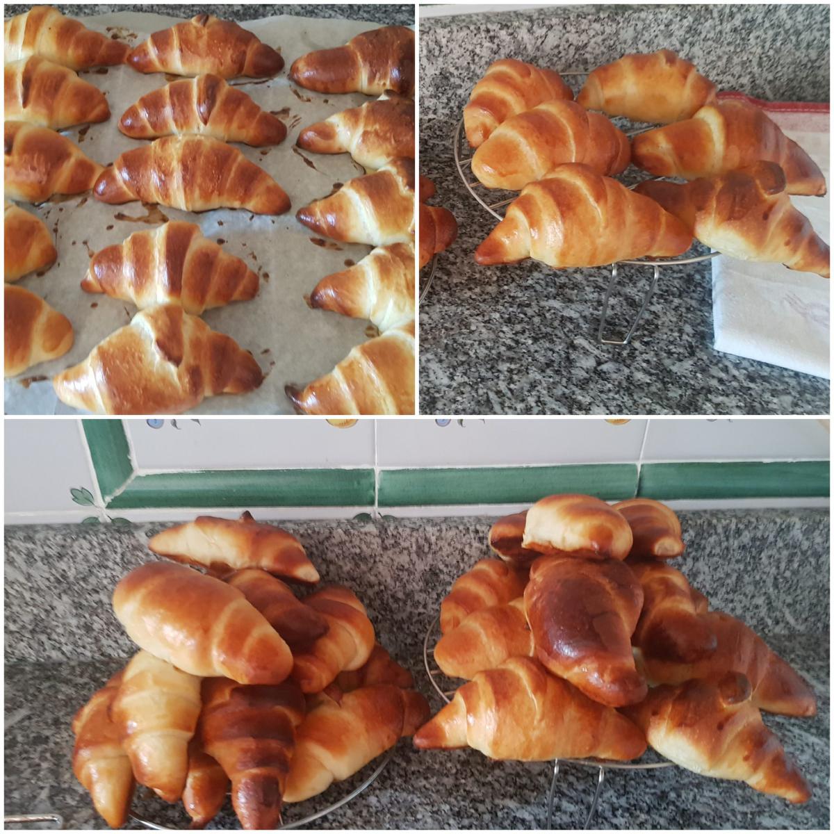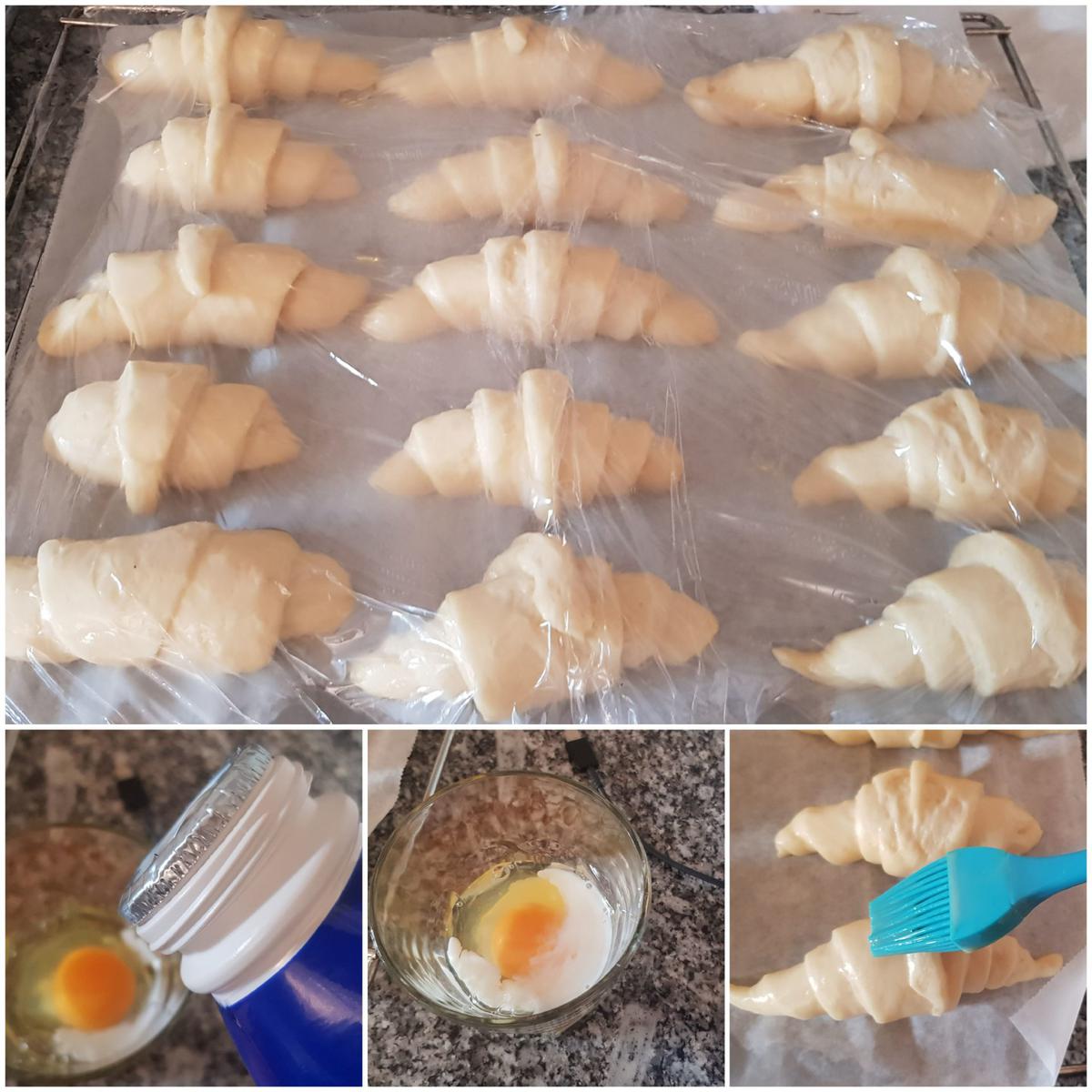 Precalentar el horno a 180ºC Cuando hayan duplicado su volumen, es hora de hornearlos, precalentamos el horno a 180ºC con calor arriba y abajo y con ventilador si lo tenéis, si no no pasa nada. Pincelamos las medias lunas con un huevo batido al que añadiremos un poco de leche. Metemos la bandeja en el horno y dejamos hornear durante unos 12-15 minutos, dependiendo del horno. En el mío estuvieron en 12 minutos, pero eso es cuando veáis que está doraditos y a vuestro gusto los sacáis.