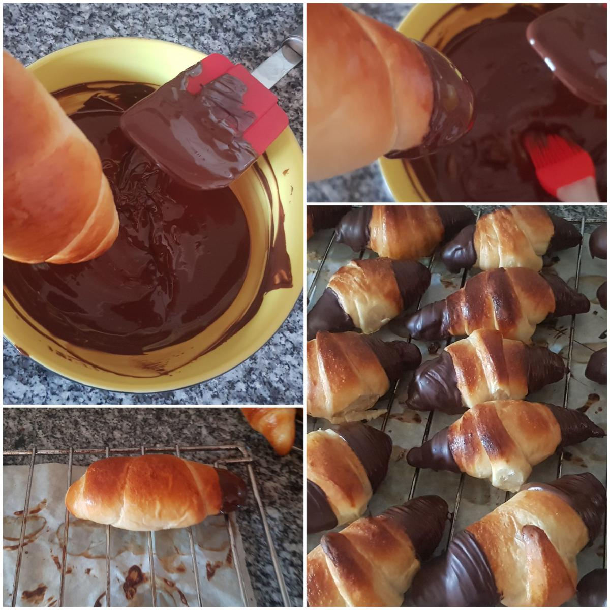 Decorar Una vez fríos ya toca decorar, podéis hacer un almíbar y pintarlos por encima, espolvorearlos con azúcar glass, o como en mi caso, derretí una tableta de chocolate para postres y pincelé las puntas, luego los deje sobre la rejilla hasta que se secó el chocolate.