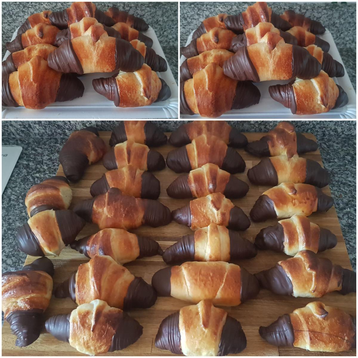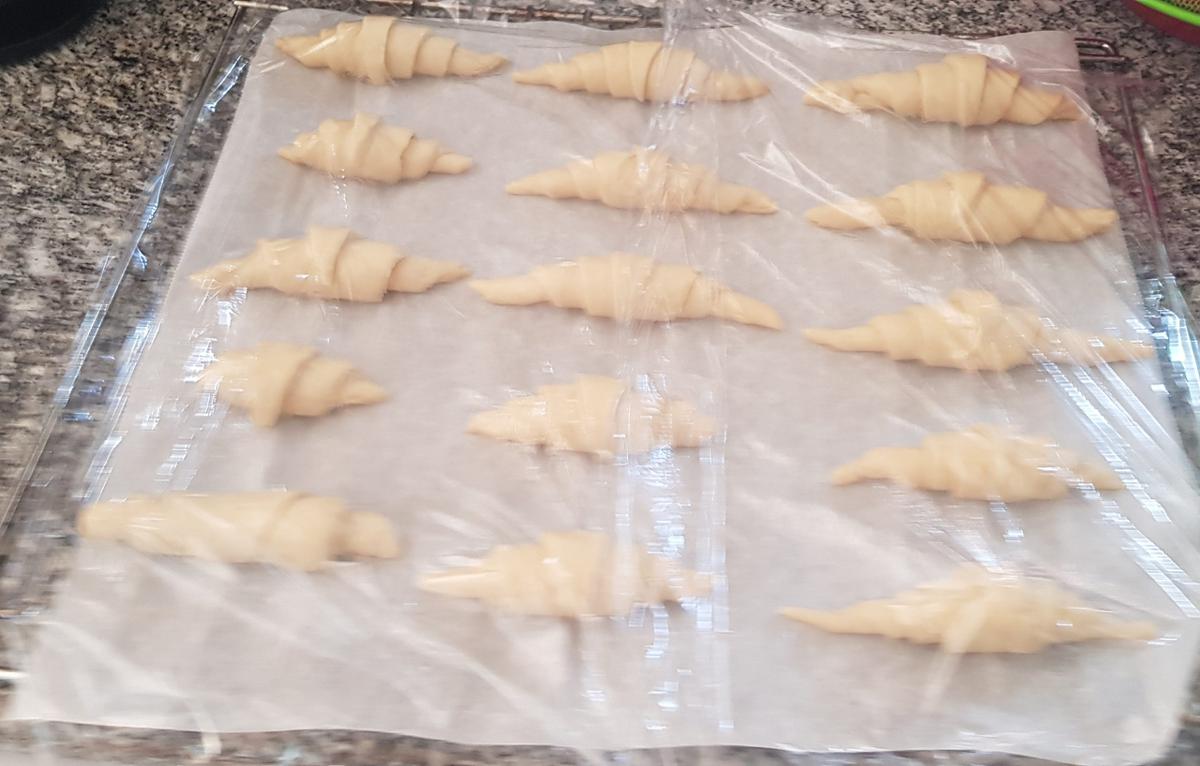 Os comento que los hice de un tamaño medio y me salieron 25 Medias Lunas de Chocolate, como veréis en las imágenes, cuando estiré la masa, lo hice de forma rectangular y la dividí en dos, y luego partí los triángulos. Tener en cuenta que aunque os parezcan algo pequeños a la hora de hacerlos, luego está el segundo levado, donde duplicarán el volumen.