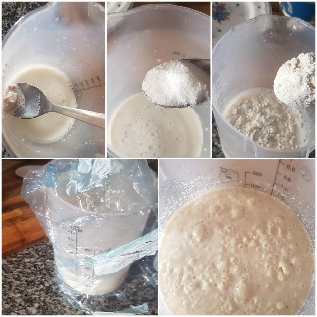 Tiempo necesario: 4 horas.Activar la levadura En la leche tibia le añadimos la levadura y disolvemos bien, luego le añadimos una cucharada de azúcar del total de la receta, y dos cucharadas de harina del total de la receta, y removemos bien con la ayuda de una cuchara. Tapamos y dejamos actuar unos 15 minutos, veréis que se hace como una espuma con burbujitas, eso significa que la levadura está activada.