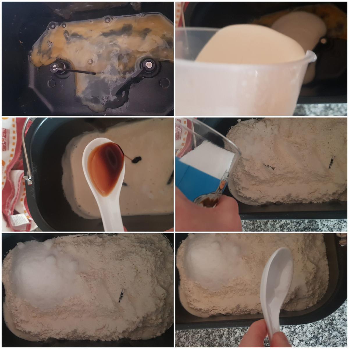 Mezclar los ingredientes Como ya sabéis, yo las masas con levado las hago en la panificadora, pero perfectamente podéis hacer la masa a mano o en la batidora con el aplique del gancho, los ingredientes serán en el mismo orden. si la hacéis a mano o en la amasadora, será un amasado de unos 10 minutos. Batimos ligeramente los huevos, le añadimos la levadura activada, la esencia de vainilla, la harina, que cubra bien todos los ingredientes de bajo, encima de la harina ponemos el azúcar, y en una esquinita la sal. Yo lo pondré en el programa 10 de la panificadora que es MASA. si la hacéis a mano, ir removiendo de dentro hacia afuera con movimientos circulares, hasta que tengáis la masa compacta. Con la amasadora y el gancho ponerlo a velocidad media.