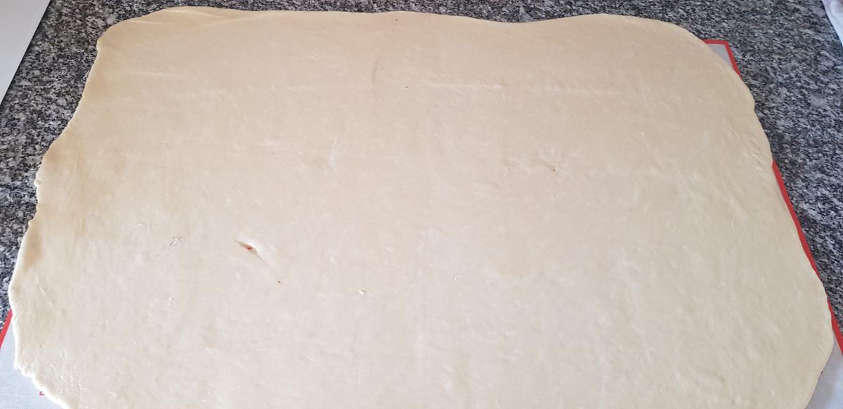Extender la masa Pasado el tiempo de levado. Sacamos la masa encima de la encimera y la desgasificamos, le sacamos todo el aire amasándola un poco, luego con la ayuda de un rodillo extendemos la masa en forma rectangular.