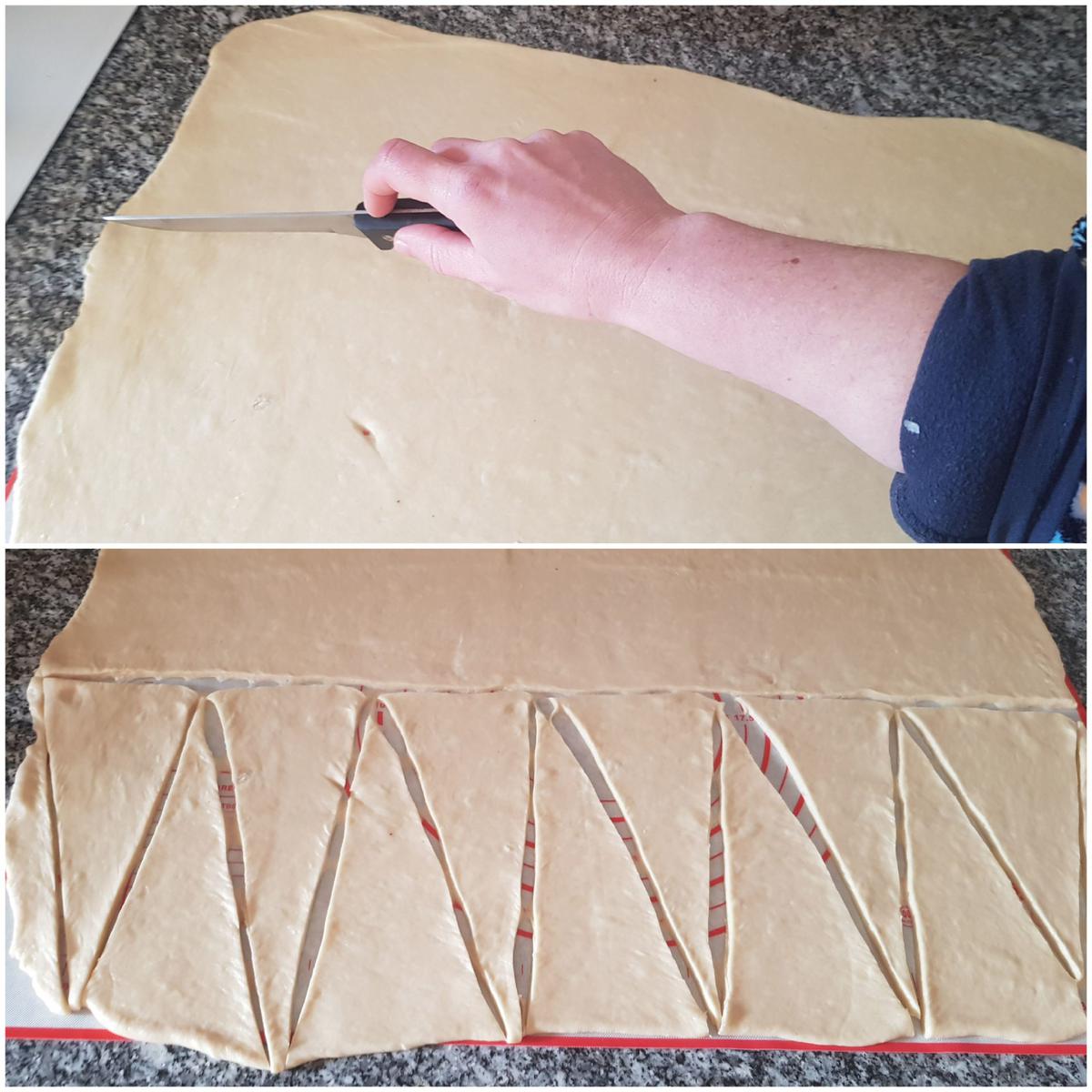 Cortar la masa Una vez tengamos el rectángulo, cortamos la masa por la mitad a lo largo, y con el cuchillo hacemos los triángulos, en la parte de abajo y luego lo mismo con la parte de arriba. Yo los hice a ojo, no usé reglas ni nada.