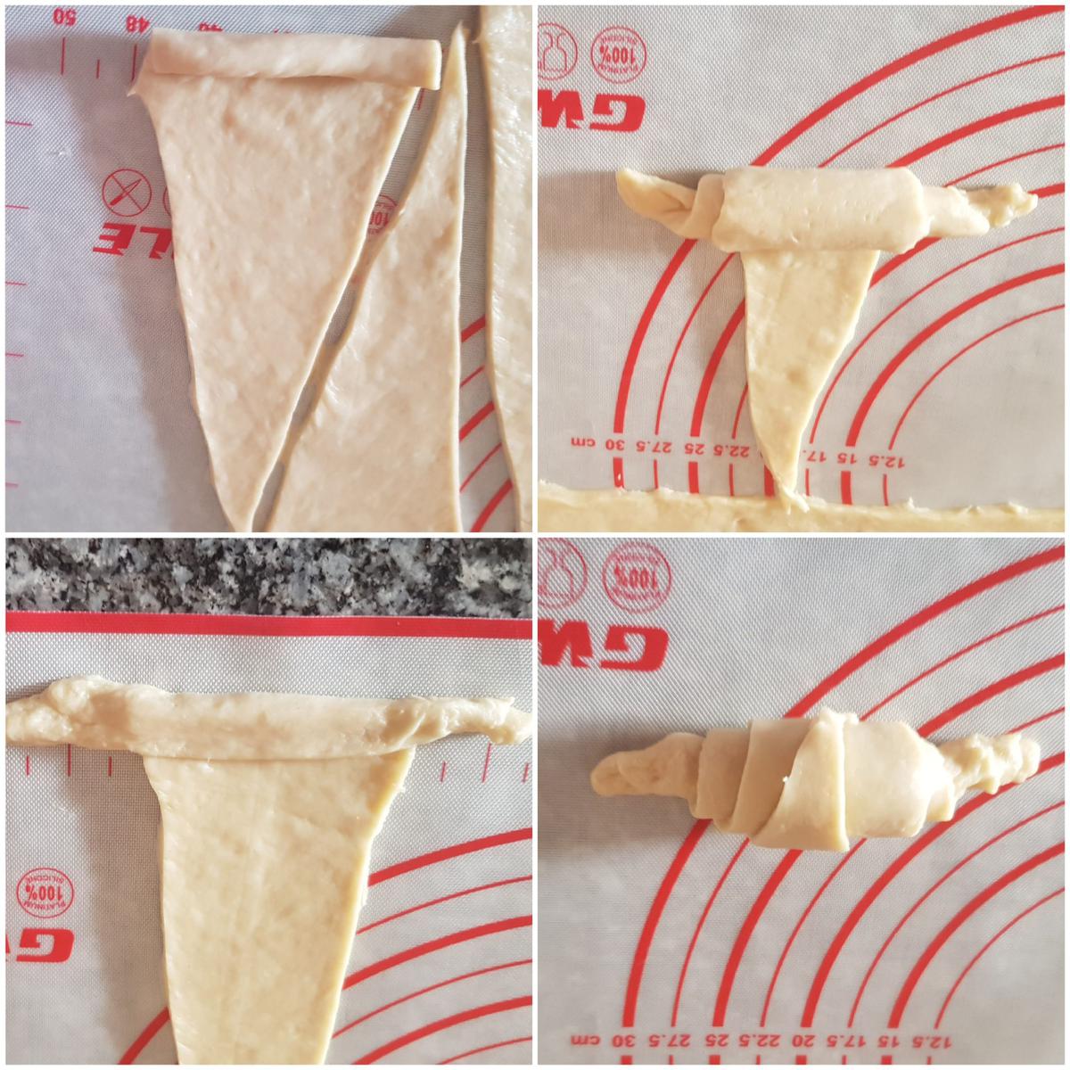 Hacer las Medias Lunas Cogemos un triángulo y empezamos a enrollar desde la parte ancha, hasta la punta. Extendemos un poco la parte ancha en la primera vuelta para que nos quede la forma del cuernito, y enrollamos hasta el final. Vamos dejándolos sobre una bandeja con papel de horno, con dos dedos de separación entre uno y otro.