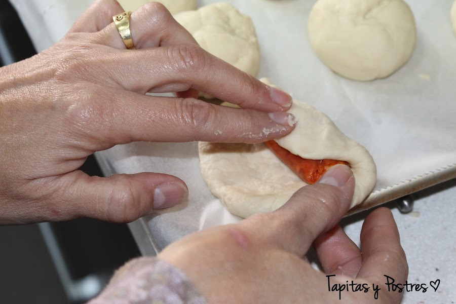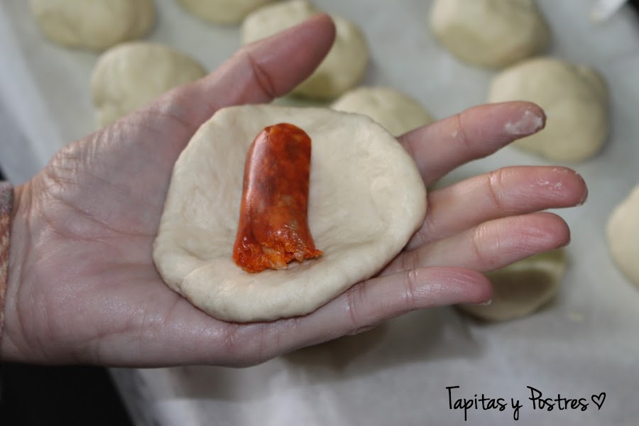 Dividir la masa en porciones de unos 40 gr, darle forma de bola y aplastar en la palma de la mano. Poner un trocito de chistorra y cerrar la masa doblando los lados hacia dentro, pellizcando en donde se cierra. Redondear con las manos y dejar reposar en una bandeja con un paño por encima hasta que crezca.