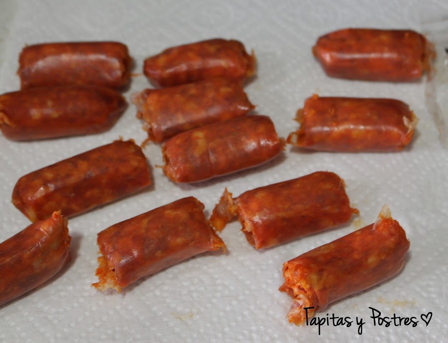 Cuando la masa haya reposado, cortamos en porciones de unos 40 gramos mas o menos. Aplastamos cada porción en la palma de la mano y ponemos un trozo de chistorra en medio.