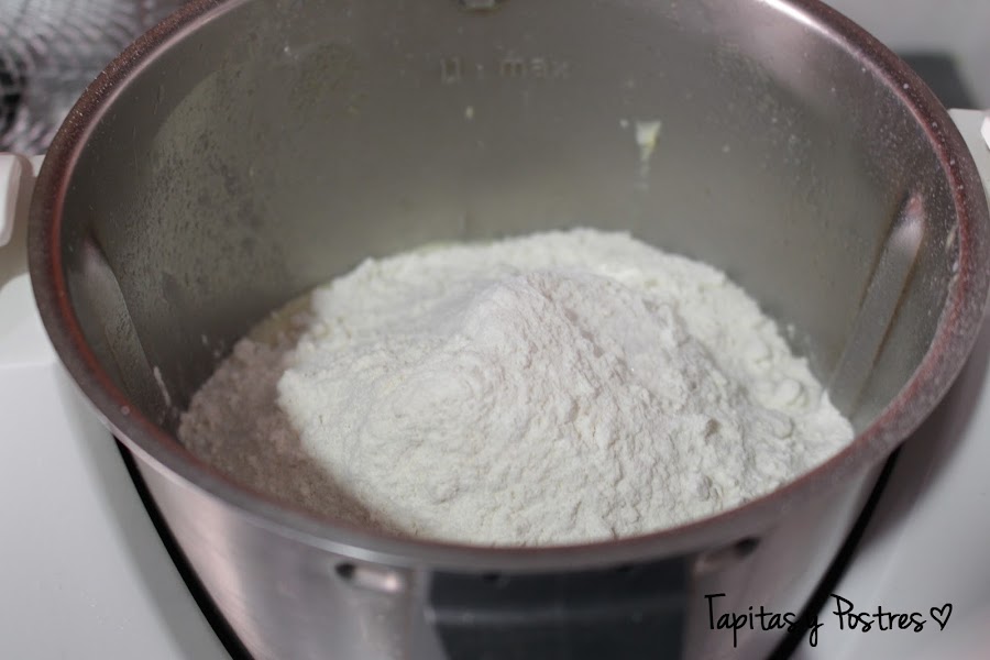 Incorporar la harina y la sal y amasar 10 segundos a velocidad 4 y a continuación, amasar 3 minutos, vaso cerrado, velocidad espiga.