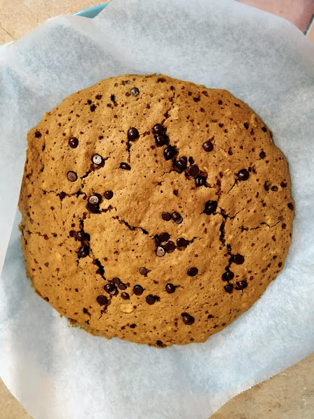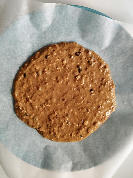Preparamos una plato apto para microondas con un papel vegetal, vertemos la masa en el centro y con ayuda de una espátula esparcimos un poco, dándole forma redonda, ponemos por encima los demás chips de chocolate.