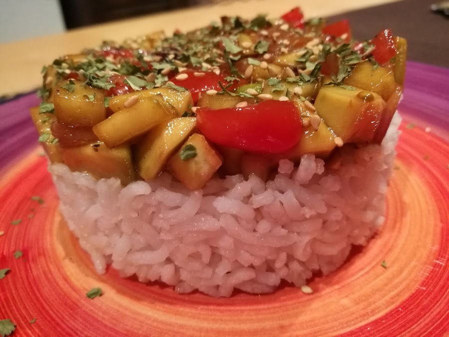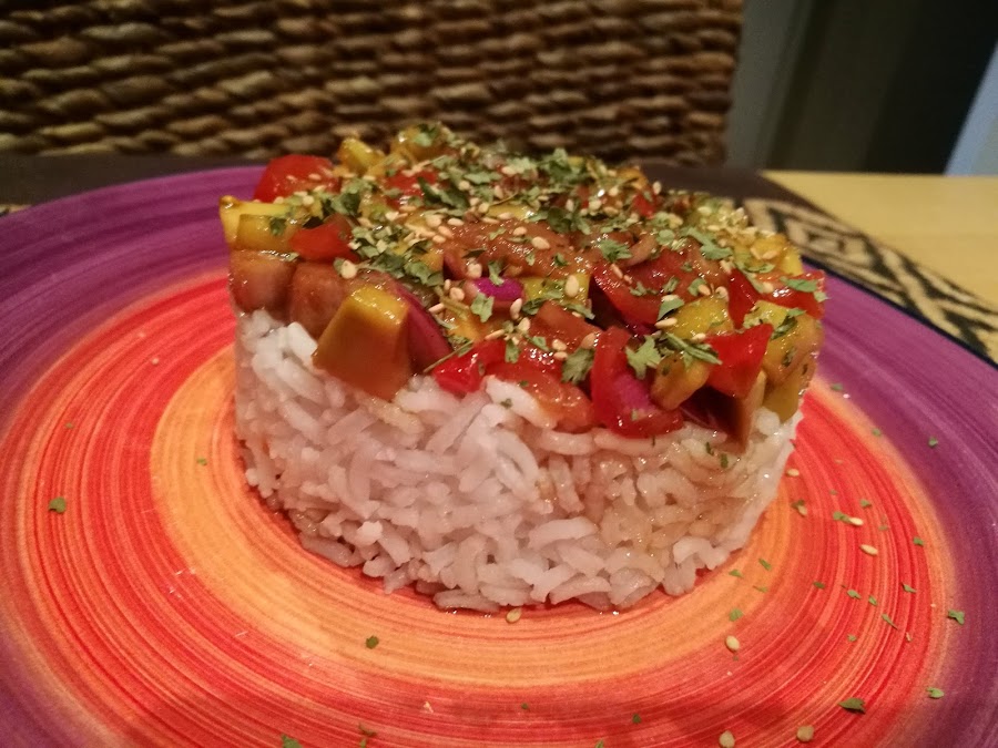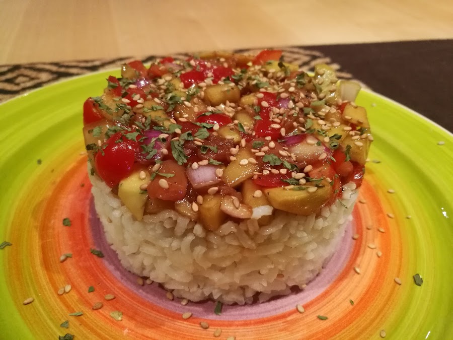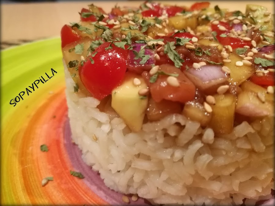 - Con un aro de emplatar, ponemos el arroz y lo cubrimos con las verduras. Espolvoreamos el sésamo y servimos.