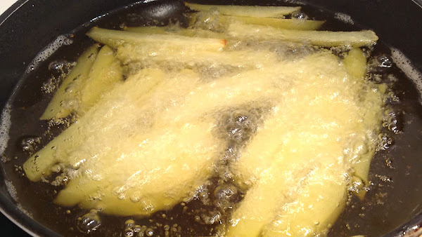 Prepara una sartén con abundante aceite de oliva a fuego medio. Fríe en ella las patatas durante unos 10 minutos. Apártalas del fuego y déjalas.