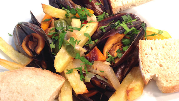 Estos mejillones acompañados de verduras, patatas, salsa y un buen pan hacen de este un plato muy completo.