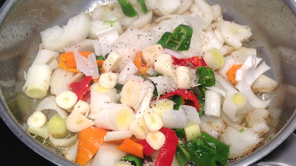 Mientras prepara una olla grande donde quepan los mejillones y en ella sofríe toda la verdura picada con un poco de aceite de oliva. Pon un poco de sal y algo de pimienta blanca molida.