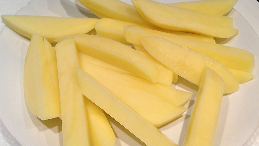 Pela, enjuaga y seca las patatas. Córtalas en bastones.