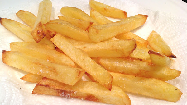 Mientras se abren los mejillones pon la sartén de las patatas al fuego a máxima potencia hasta que se doren y terminen de hacerse. Escurre las patatas del aceite a una fuente con papel de cocina. Sazona.