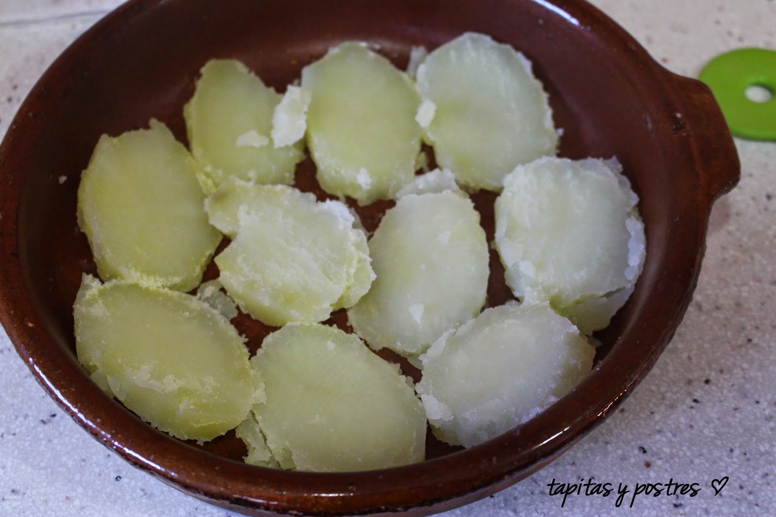 Cuando las patatas estén tiernas, las cortamos a rodajas y las colocamos como fondo en una cazuela de barro.