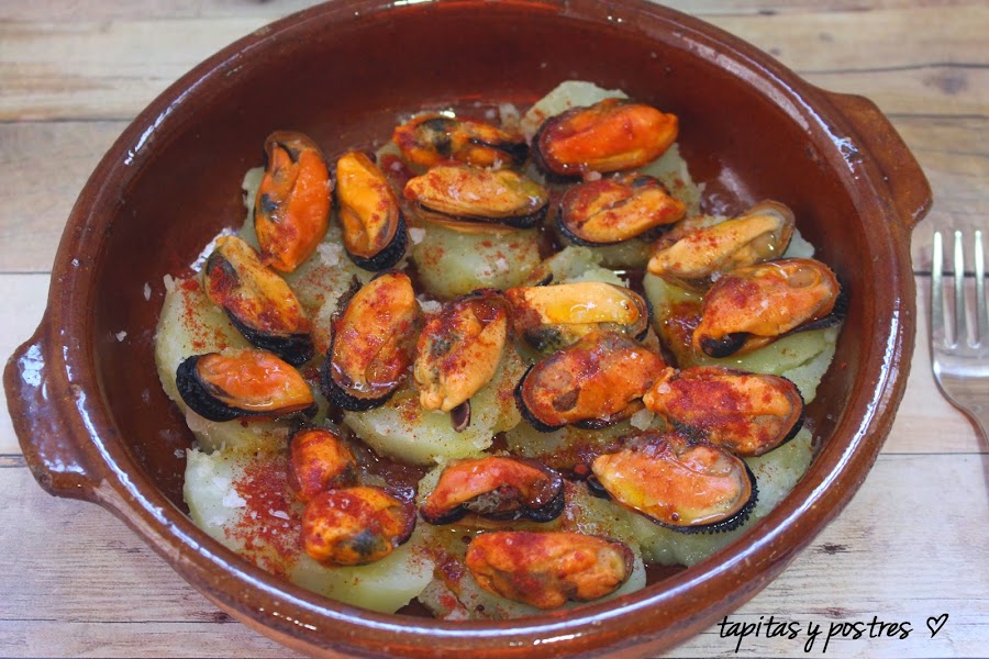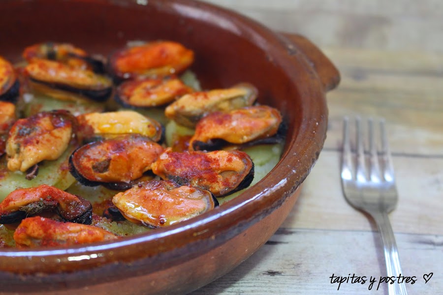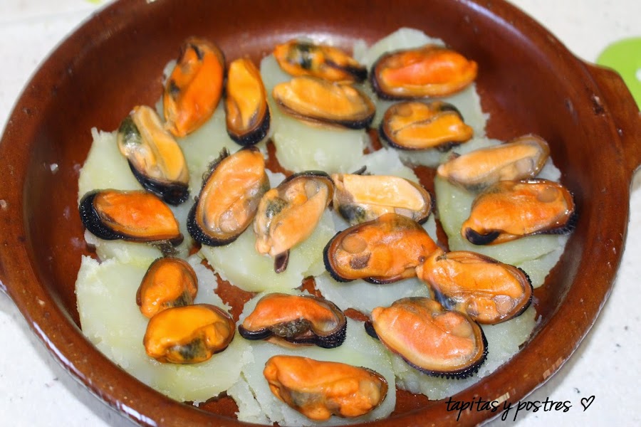 Colocamos los mejillones encima y aderezamos, aceite, pimentón y sal.