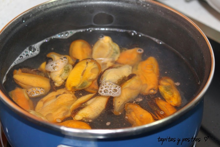 Como he usado mejillones congelados ya cocidos, les he dado un hervor para descongelarlos y tomarlos calentitos.