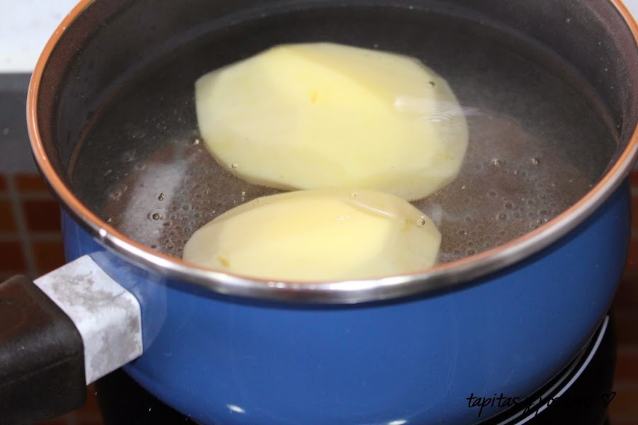Pelamos las patatas y las ponemos en un cazo con abundante agua y sal a cocer. las dejamos hasta que estén tiernas, unos 40 minutos.