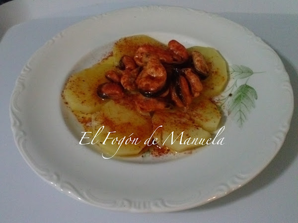 Agregamos los mejillones sal gorda, un poquito de pimentón y un buen chorro de aceite.