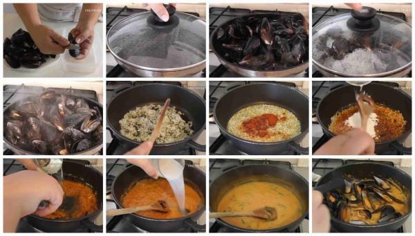 En ese momento añadimos los mejillones limpios, tapamos de nuevo y dejamos unos 2 o 3 minutos, el tiempo justo para que se abran los mejillones.