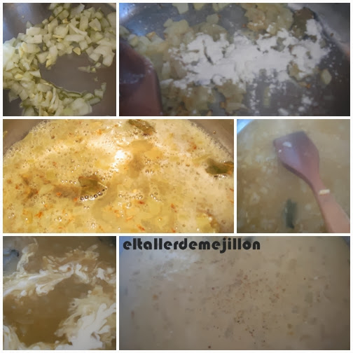 En otra olla vertemos un chorro de aceite y cuando esté caliente añadimos la cebolla, los dientes de ajo picados y la hoja de laurel. Dejamos que vaya dorándose todo y ponemos una cucharada de harina y vertemos los 350 ml de sidra, sin parar de remover. Añadimos agua de cocción y dejamos que se vaya engordando la salsa. Finalmente incorporamos 30 ml de nata (crema de leche) para cocinar y pimienta.