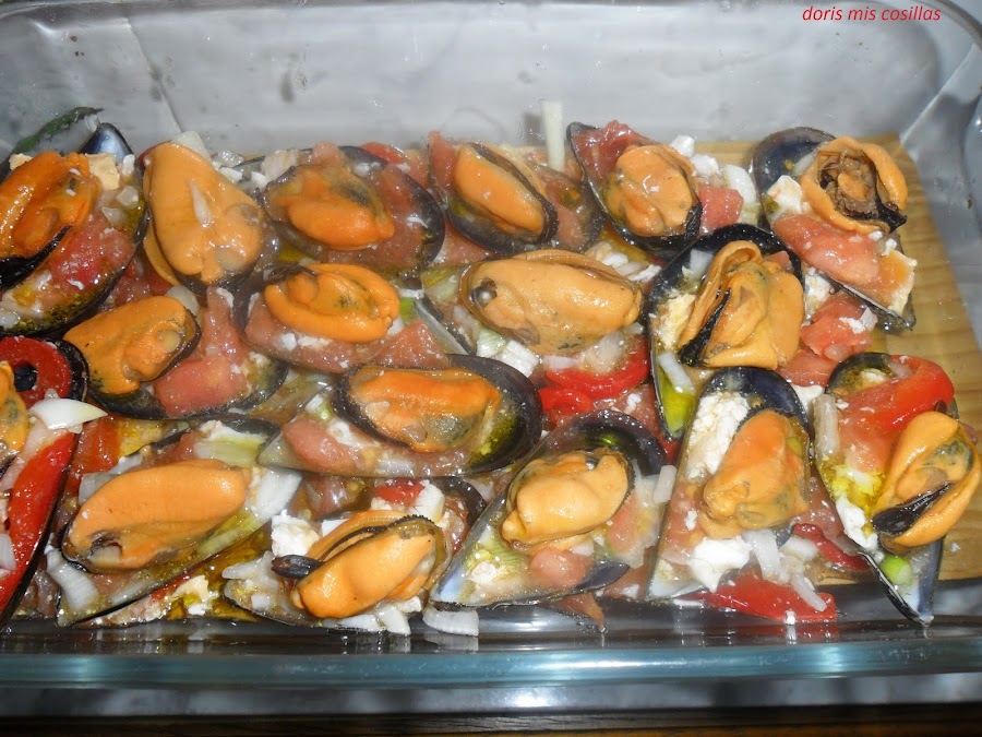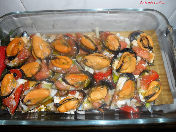 En una fuente de servir, ponemos en el fondo una capita de la vinagreta bien fresquita, encima de cada carcasa de mejillón una cucharadita de la vinagreta y un mejillón.Regamos con un hijo de aceite, dejamos en la nevera tapado hasta el momento de servir.