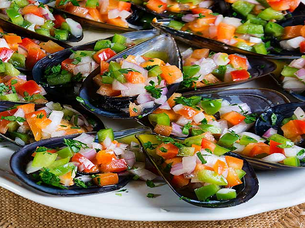 En una fuente ponemos una capa de mejillones y sobre cada uno depositamos una cucharada de vinagreta.