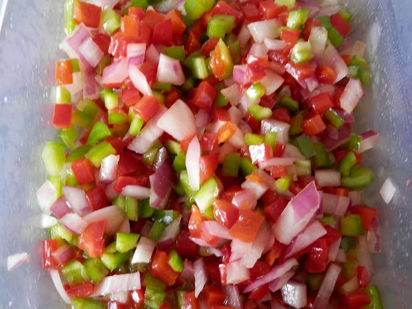 Pica la cebolla y los pimientos en cuadritos pequeños.