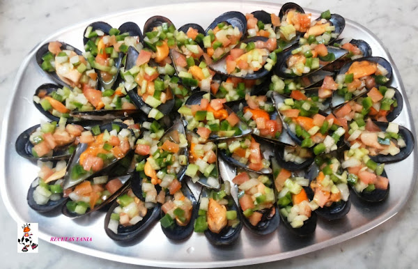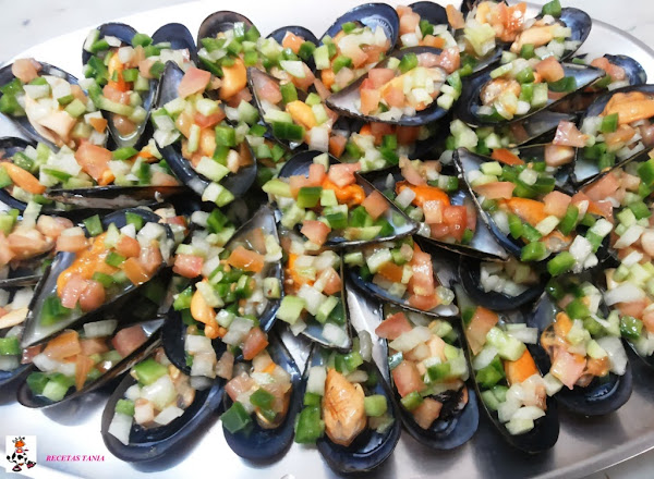 Limpiamos los mejillones por fuera y ponemos un caldero con agua y sal al fuego. Añadimos los mejillones y dejamos al fuego durante media hora mas o menos. Escurrimos el agua, separamos los mejillones y colocamos en una bandeja. En un bol ponemos el pimiento,la cebolla,el tomate y el pepino picadito,añadimos un chorrito de aceite de oliva,un chorrito de vinagre y sal. Removemos bien y con una cuchara vamos rellenando los mejillones. Metemos en la nevera y cuando estén bien frios a comer...
