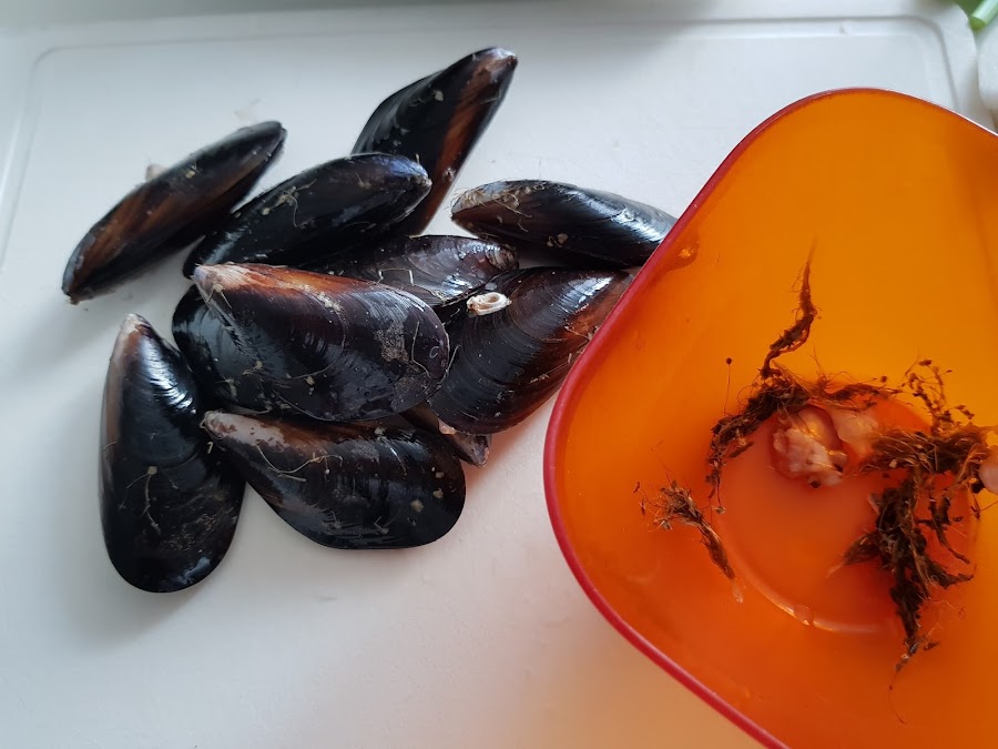 3. - Mientras, con paciencia, vamos limpiando los mejillones, quitándoles las "barbas".