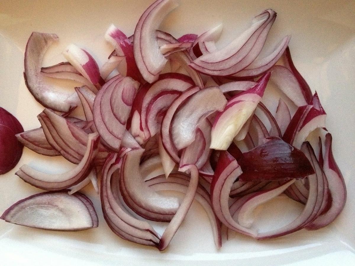 5 Comenzamos a cortar la cebolla , en juliana y ponemos a calentar un poquito de aceite en una sartén .