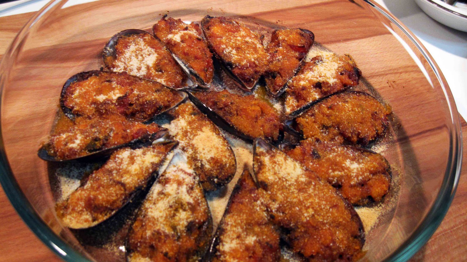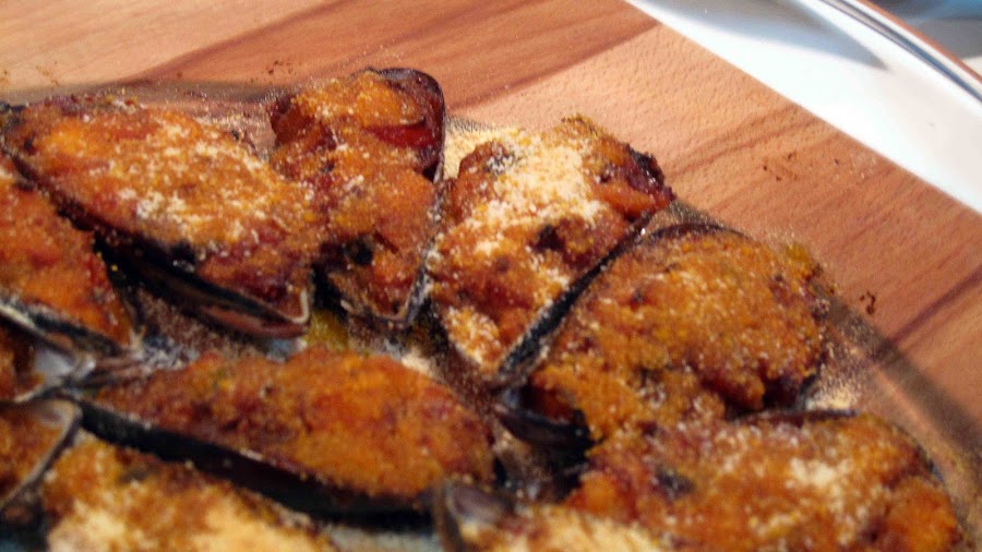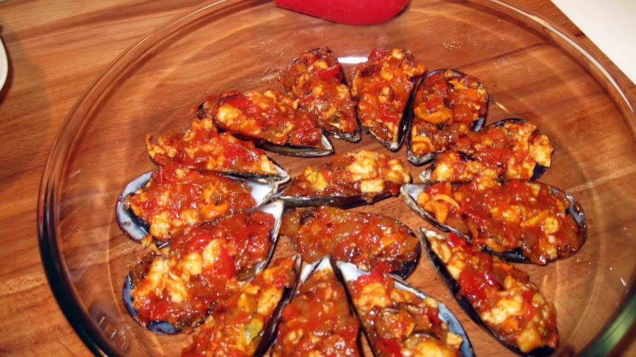Movemos bien para que todo se mezcle y vamos rellenando las conchas de los mejillones.