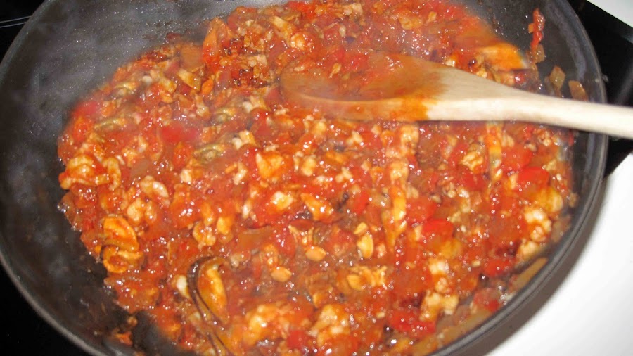 Cuando los langostinos cojan un color rosado le ponemos el tomate frito.