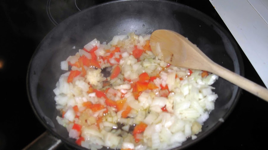 Partimos la cebolla, el ajo y el pimiento a trocitos pequeños y lo ponemos a freír.