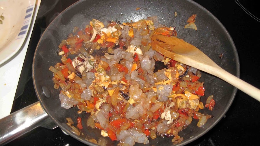 Cuando ya este un poco dorado le ponemos los mejillones y los langostinos, partidos a trozos.